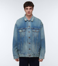The Patched jacket from Balenciaga is unisex and made from distressed Japanese Denim. The design features engraved flex buttons and has all-over rips and repairs. Product Details - Care instructions: machine wash at 30 degrees - Made in Japan - Buttoned cuffs - Designer color name: True Blue - Pockets: side slit pockets, buttoned pockets - Closure: buttoned front - Material: 100% cotton - Pocket lining: 100% cotton - Item number: P00765202 Size & Fit - Fits large to size - we recommend trying one size smaller - Designed for an extremely oversized fit - Dropped shoulders - Mid-weight material - Falls below the hip - The model in the picture is 185cm-6'1" and wearing a size 1