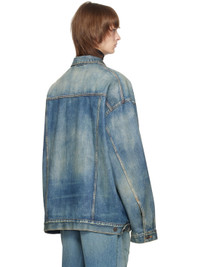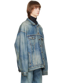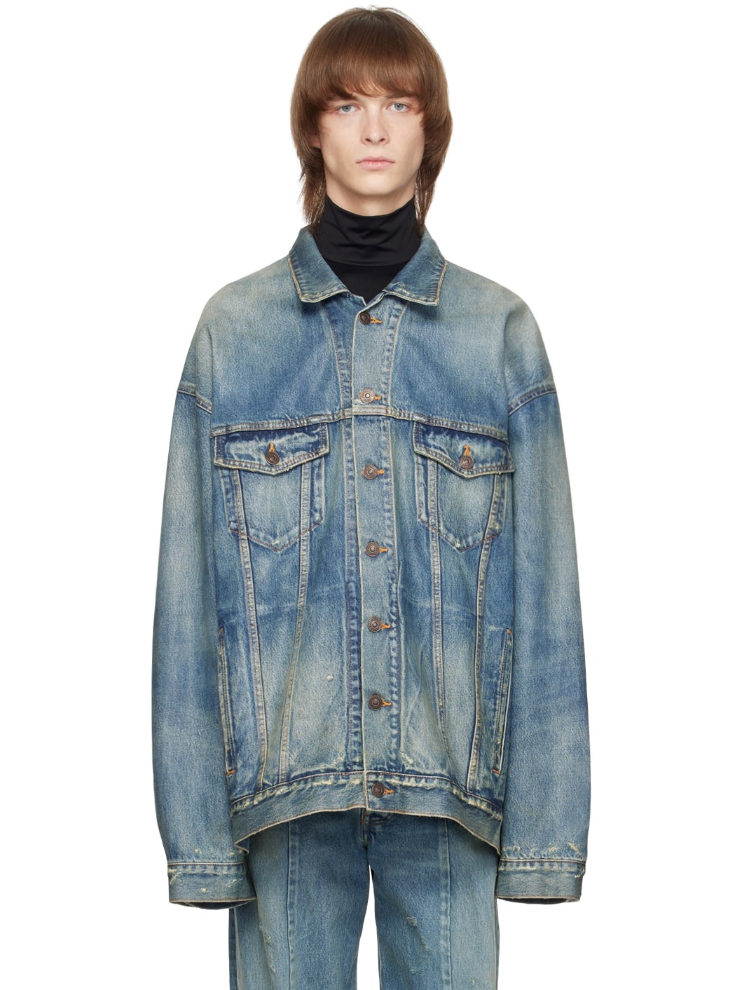 Non-stretch denim jacket. Distressing and fading throughout. · Spread collar · Button closure · Flap pockets and welt pockets · Adjustable button tab at side seams · Single-button barrel cuffs · Logo-engraved bronze-tone hardware · Contrast stitching in yellow Supplier color: True blue