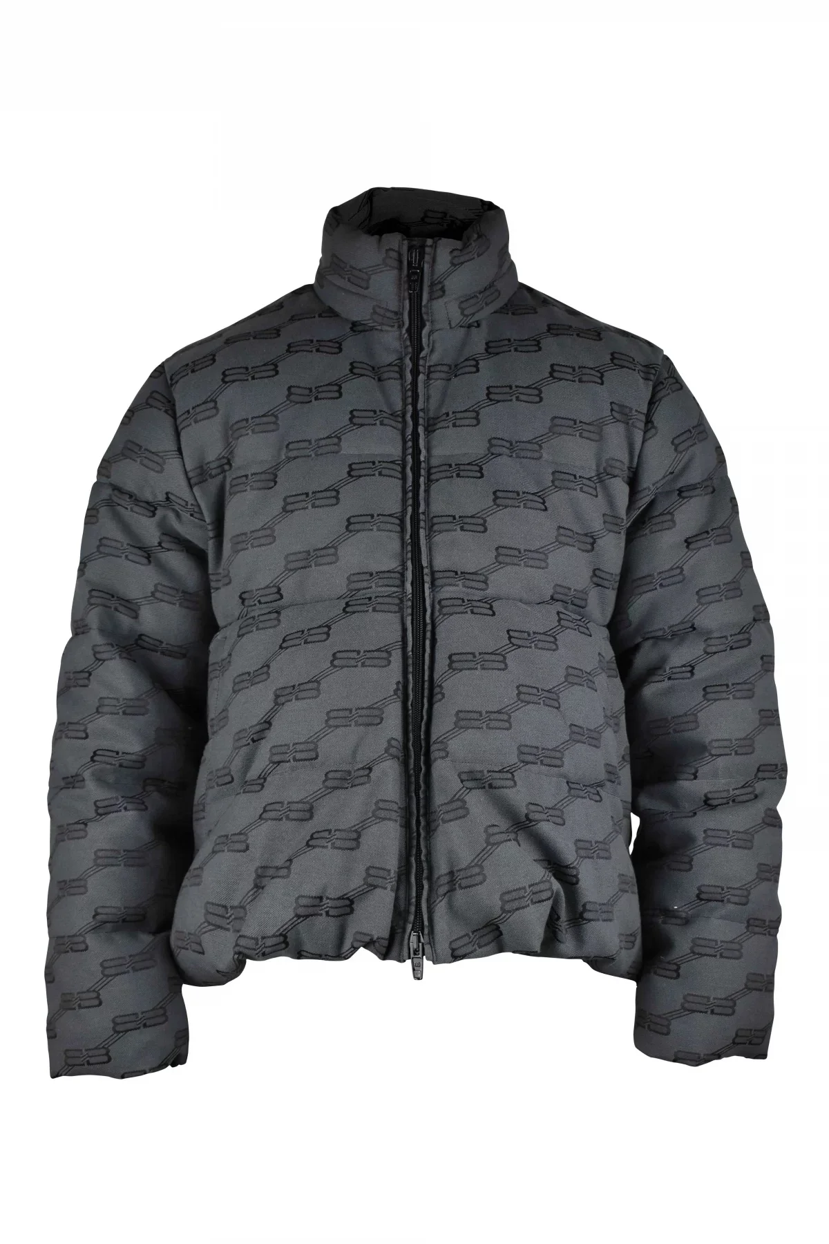 Balenciaga dark gray quilted down jacket. Balenciaga monogram throughout. High collar. Main zipper closure. Two side pockets with snap closure. Long sleeves.