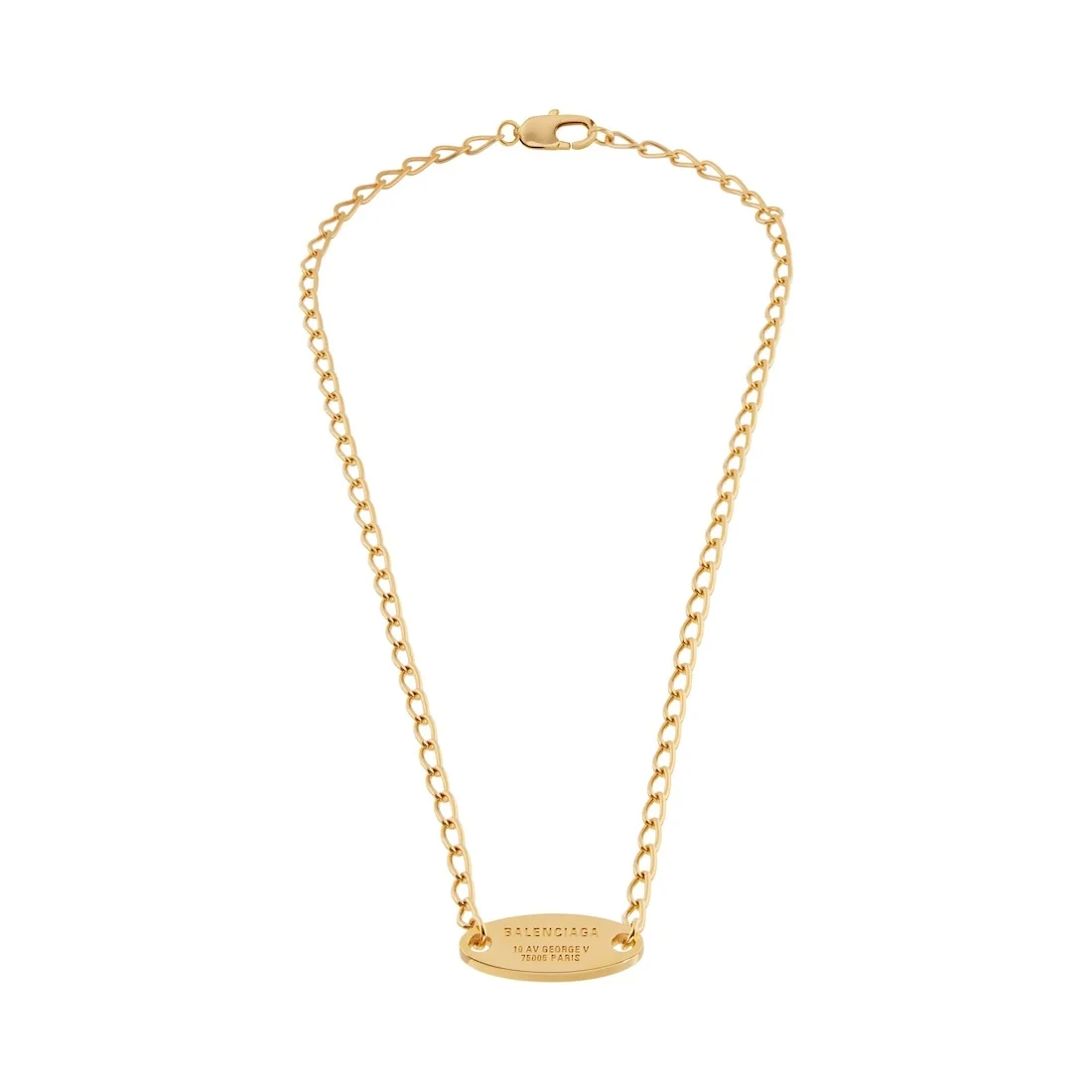 Everyday Necklace in shiny gold brass PRODUCT DETAILS • Dimensions: L16,54 x H8,27 x W0,08 inch • Brass • Necklace • Balenciaga and 10 AV George V 75008 Paris logo engraved on the front of the plate • BB logo engraved on the back of the plate • Adjustable chain • Clasp closure • Made in Italy • This item is nickel-free, lead-free, and hypoallergenic Material: brass