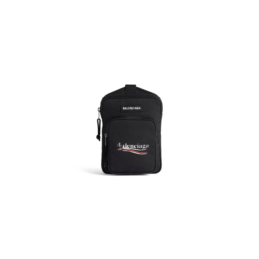 Explorer Crossbody Messenger Bag in black recycled nylon PRODUCT DETAILS • Dimensions: L7 x H8,6 x W3,1 inch • Nylon • Messenger bag • Adjustable crossbody strap (25,2 inch) • Political stencil logo printed at front • Balenciaga logo patch at front • Matte black hardware • Zipped closure • 1 main compartment • Front zipped pocket • BB logo engraved zipper puller with cotton string • Cotton canvas lining • Made in Italy Material: polyamide, polyester