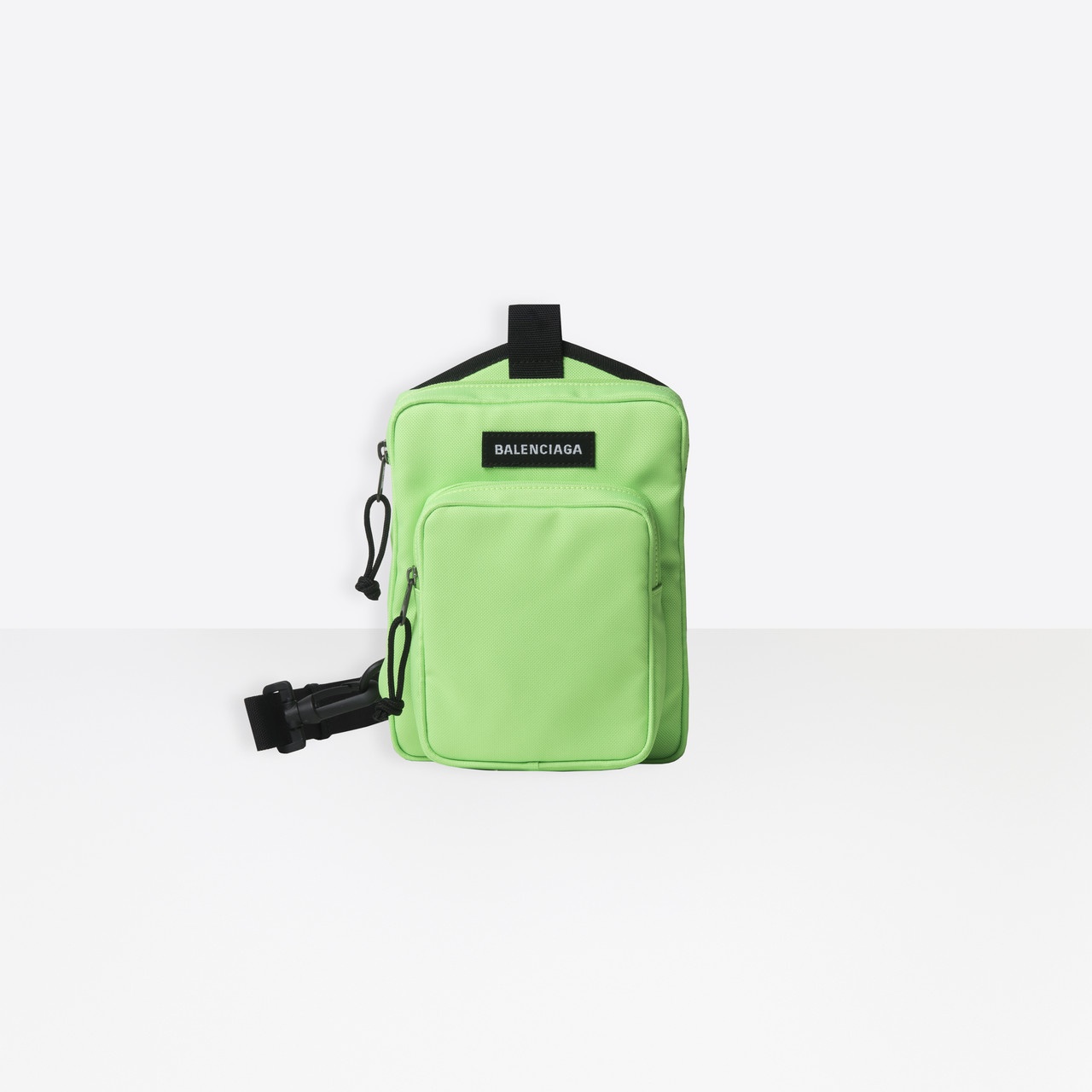 Explorer Crossbody Messenger in neon green recycled nylon PRODUCT DETAILS Dimensions: W 7.8 inches H 6.2 inches D 3.1 inches Composition: 100% Polyamide - - Recycled casual nylon - Small travel bag - Adjustable and removable crossbody strap - Zipped closure - 1 front zipped compartment - 2 zipped pockets, one on front, one on top - Canvas lining - Front embroidered logo patch - Made in Italy - Wipe with a soft cloth - The item comes with a Balenciaga dustbag