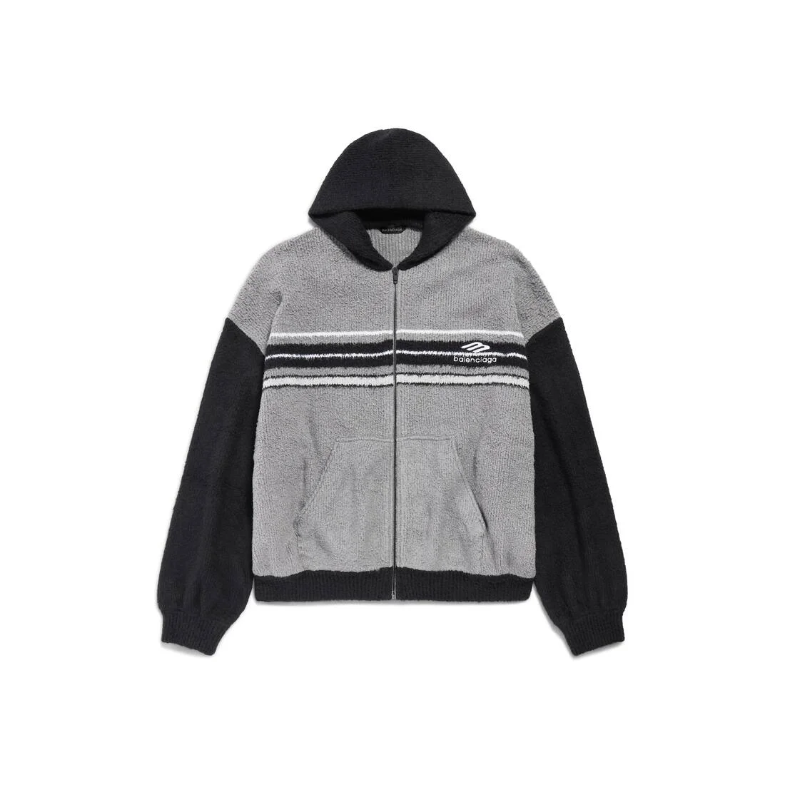 Fluffy Zip-Up Hoodie in grey, black and white hairy sportswear cotton knit for Men PRODUCT DETAILS • Fluffy cotton blend knit • Hood without drawstring • Dropped shoulders • 2 pockets at front • Gathered at cuffs and waistline • 3B Sports artwork embroidered at front • Made in Portugal Main material: 80% cotton, 16% polyamide, 4% elastane