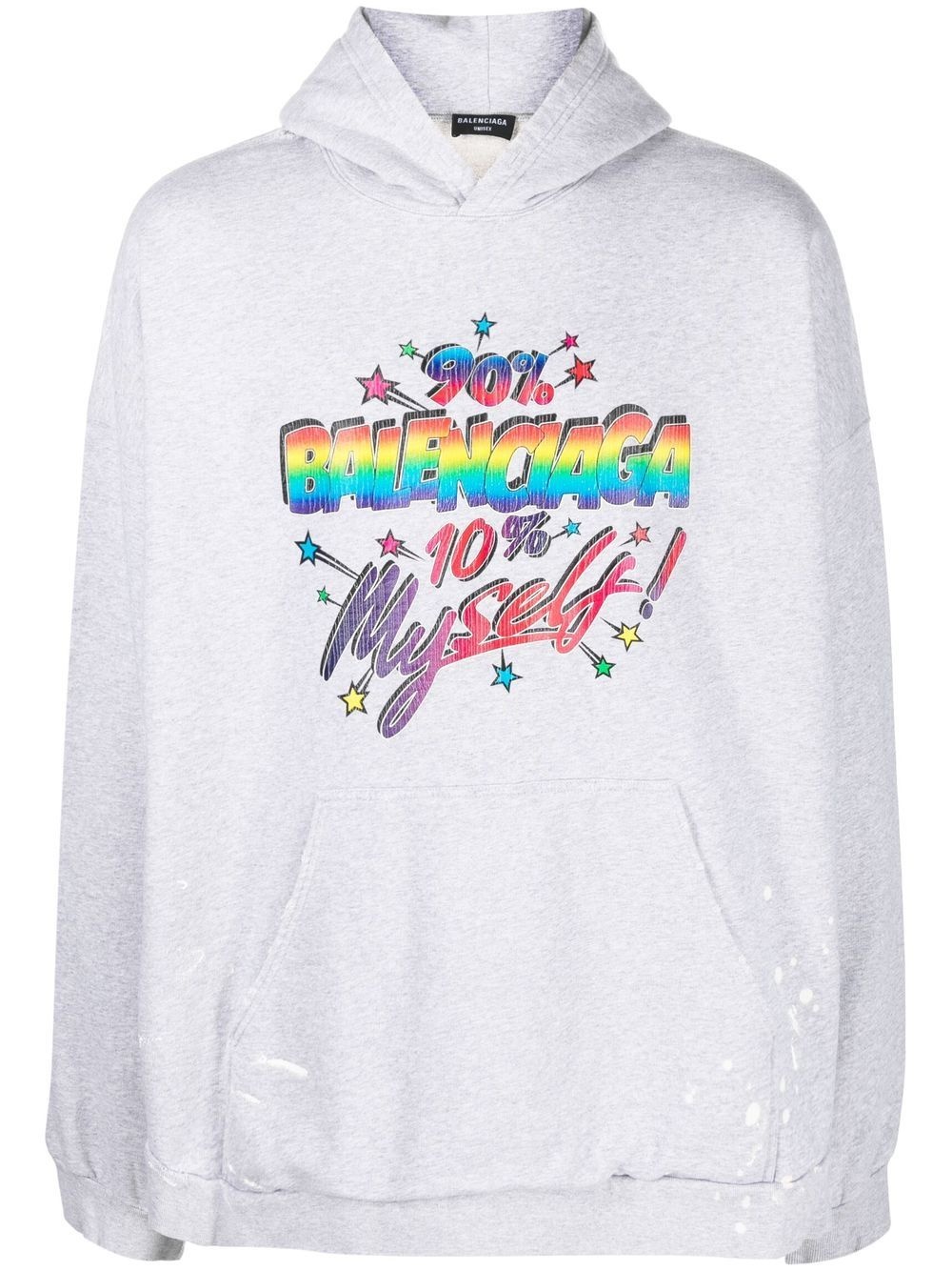 graphic wide-fit hoodie graphic wide-fit hoodie from BALENCIAGA featuring grey, graphic print at the chest, slouchy hood, distressed effect, long sleeves, drop shoulder, ribbed cuffs and ribbed hem. POSITIVELY CONSCIOUS: We've partnered with Good On You — an ethical agency that rates how sustainably brands perform across various people, planet and animal welfare criteria. This product comes from a Conscious brand that performs well in relation to their impact on the planet, for example ensures the use of materials that limit the amount of chemicals, water and wastewater involved in production processes.. Imported Composition Outer: Cotton 100% SIZE & FIT Model measurements Height 5 ft 9 in(1.74 m) Bust/Chest 32.3 in(82 cm) Hips 35.8 in(91 cm) Waist 24 in(61 cm) FittingInformation This piece fits true to size. We recommend you get your regular size Cut for a loose fit Made with a mid-weight fabric