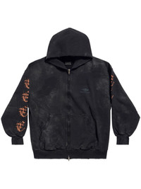 Heavy metal artwork zip-up hoodie Showing Balenciaga's innovative design, this zip-up hoodie has a worn-out and dirty effect and is decorated with Heavy metal artwork bleached out at the back and sleeves. Its relaxed cut is crafted from cotton and finished with a 3B Sports Icon artwork embroidered at the chest. Highlights - Black - Cotton - Bleached effect - Logo print at the chest - Logo print to the rear - Front zip fastening - Two diagonal pockets to the sides - Long sleeves - Straight hem - Classic hood - We've partnered with good on you — an independent agency that rates how brands perform in relation to their impact on the planet, people and animals, with a multi-criteria rating simplified to a five points scale. in order to be awarded our conscious label, larger brands need to score a minimum of four out of five ('good'), while smaller brands must score at least three out of five ('it's a start'). - This item comes from a brand rated four out of five ('good') by good on you. please note, this is a brand-level rating and does not guarantee that this product is made with conscious materials. Imported Composition Cotton 100%