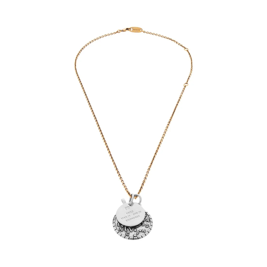 Horoscope Aries Necklace in mix of gold and silver recycled brass and brass is from look 12 of Balenciaga Winter 25 Collection. PRODUCT DETAILS • Dimensions: L20,28 x H11,4 x W0,12 inch • Recycled brass and brass • Necklace • Two pendants • Adjustable chain • Clasp closure • Made in Italy • This item is nickel-free, lead-free, and hypoallergenic Material: brass