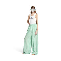 Large Pyjama Pants in green and white fluid striped cupro for Women and Men are from look 40 of Balenciaga Fall 25 Collection. PRODUCT DETAILS • Fluid striped cupro and cotton • Mid-waist • Elasticated waistband • 2 slash pockets • 1 patch pocket at back • Made in Italy Main material: 66% cupro, 34% cotton