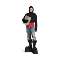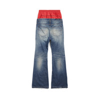 Layered Jeans in midnight black denim kuroki and black and red techno poplin are from look 10 of Balenciaga Spring 25 Collection. PRODUCT DETAILS • Cotton twill denim and techno poplin • Trompe l'œil pants: 2 different waists • Elasticated tracksuit pants waistline • 5 belt loops • 5 pockets • Low crotch • Flared leg • Balenciaga label at back • Made in Italy Main material 1: 100% cotton