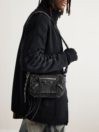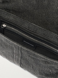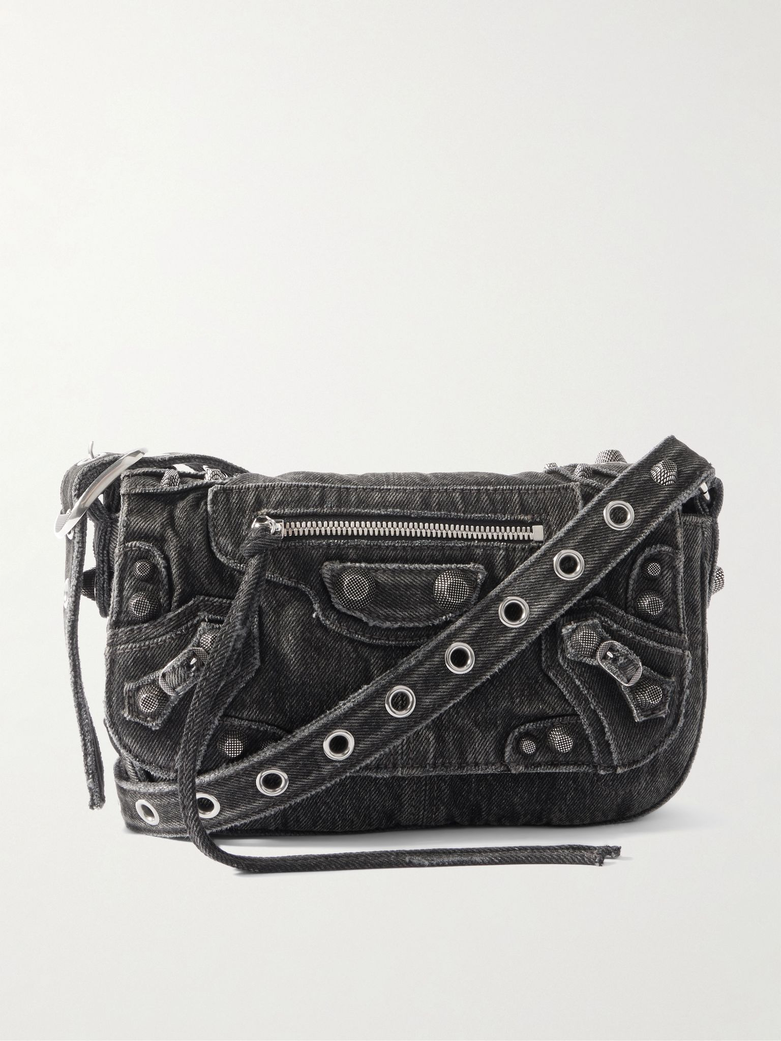 Balenciaga's iconic 'Le Cagole' range is defined by aged silver-tone studs and grommets. This 'XS' messenger bag has been made in Italy from washed-denim and features zipped pockets at the front and back to tuck your cards and ear buds. Details & Care - Charcoal washed-denim - Adjustable shoulder strap - Front and back zipped pockets, internal zipped pocket - Canvas lining - Magnetic fastening - Comes with a dust bag