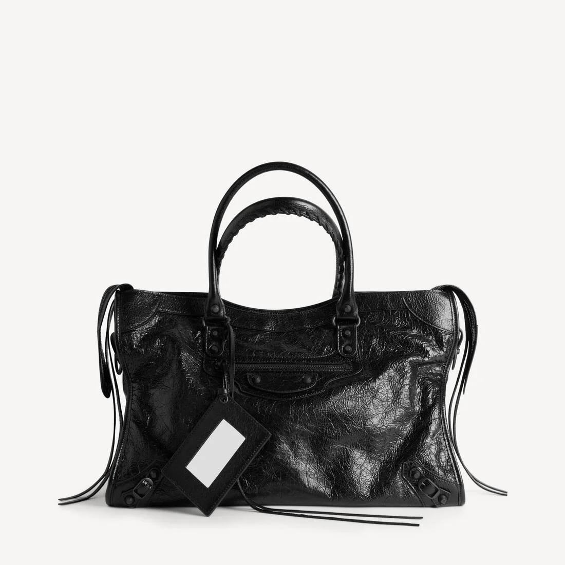 Le City Bag Large in black Arena lambskin, matte black hardware PRODUCT DETAILS • Arena lambskin • Two hand-braided handles with waxed cord • Adjustable and removable shoulder strap with shoulder pad • Crossbody and hand carry • Matte black hardware • Double-sided zip with long tails and knotted leather puller • Front zipped pocket with knotted leather puller • 1 inner zipped pocket • 1 removable mirror • Tone-on-tone Balenciaga logo debossed on mirror • Cotton canvas lining • Made in Italy Material: lambskin, cotton, brass, plexiglass