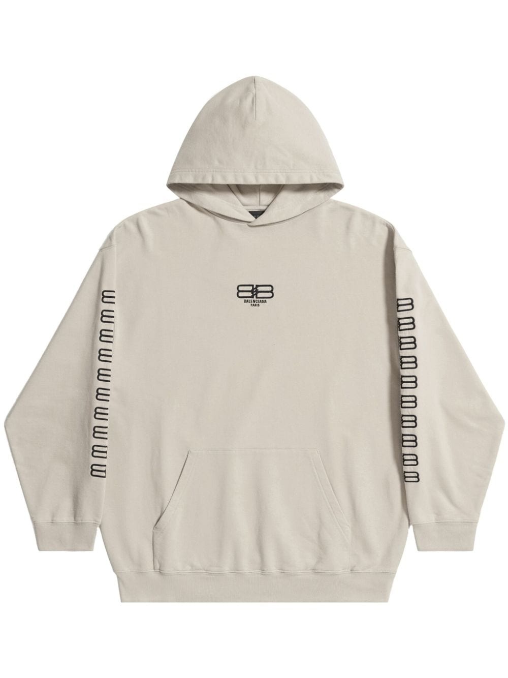 logo-embroidered cotton hoodie Aligned with Balenciaga's affinity for exaggerated silhouettes, this hoodie is cut from cotton in an oversized silhouette. It's presented in light beige and boasts the label's logo embroidered on the chest and along the sleeves. Highlights - Light beige/black - Cotton - Embroidered logo at the chest - Embroidered logo at the sleeve - Classic hood - Long sleeves - Front pouch pocket - Ribbed trim - Straight hem - We've partnered with good on you â an independent agency that rates how brands perform in relation to their impact on the planet, people and animals, with a multi-criteria rating simplified to a five points scale. in order to be awarded our conscious label, larger brands need to score a minimum of four out of five ('good'), while smaller brands must score at least three out of five ('it's a start'). - This item comes from a brand rated four out of five ('good') by good on you at the time it was added on farfetch. please note, this is a brand-level rating and does not guarantee that this product is made with conscious materials. - Learn more about what makes a product conscious on our conscious criteria page Imported Composition Cotton 100%