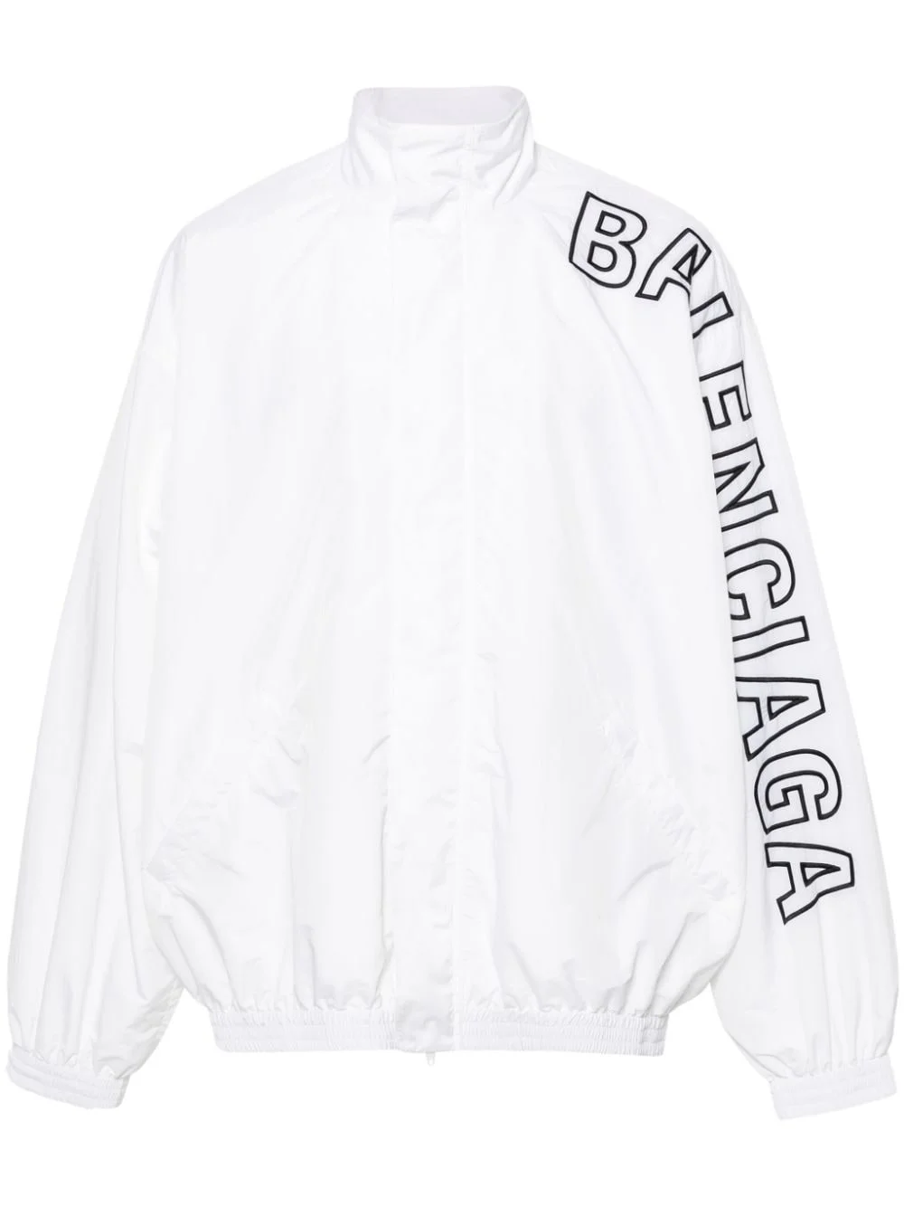 logo-embroidered jacket This Balenciaga jacket is a celebration of two signature house codes: oversized proportions and bold branding. It’s cut from white shell to a track silhouette with black logo embroidery down one sleeve and a mesh lining. Highlights - White - Shell - Embroidered logo at the sleeve - Front press-stud and zip fastening - High neck - Long sleeves - Elasticated cuffs - Two front welt pockets - Elasticated hem - Internal zip-fastening pockets - Mesh lining Made in Italy Composition Lining: Polyester 100% Outer: Polyamide 100%, Polyester 100% SIZE & FIT Model measurements Height 5 ft 11 in(1.8 m) Bust/Chest 33.07 in(84 cm) Hips 37 in(94 cm) Waist 25.59 in(65 cm) FittingInformation Designed for an oversized fit, offering additional room throughout Made from a midweight non-stretch fabric, this piece offers minimal elasticity when worn This piece fits true to size – take your usual size Measurement SLEEVE LENGTH 25.98 in(66 cm) LENGTH 30 in(76.2 cm) WAIST 55.98 in(142.2 cm) Washing instructions Dry Clean Only