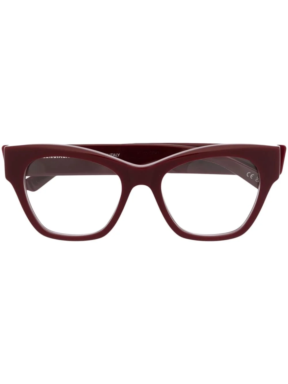 logo-engraved cat-eye glasses Crafted in a retro-inspired cat-eye silhouette, these glasses from Balenciaga Eyewear are imagined in a deep red hue for SS23. The logo print at the arm offers a signature touch to the accessory. Highlights - Wine red - Acetate - Logo-engraved arm - Cat-eye frame - Clear lenses - Straight arms - Curved tips - These glasses come with a protective case. - All glasses from farfetch are sold as non-prescription frames. Made in Italy Composition Acetate 100% SIZE & FIT Measurement Arm Length 5.51 in(14 cm) Bridge Width 0.74 in(1.9 cm) Lens Diameter 2.04 in(5.2 cm) Total Width 5.7 in(14.5 cm)