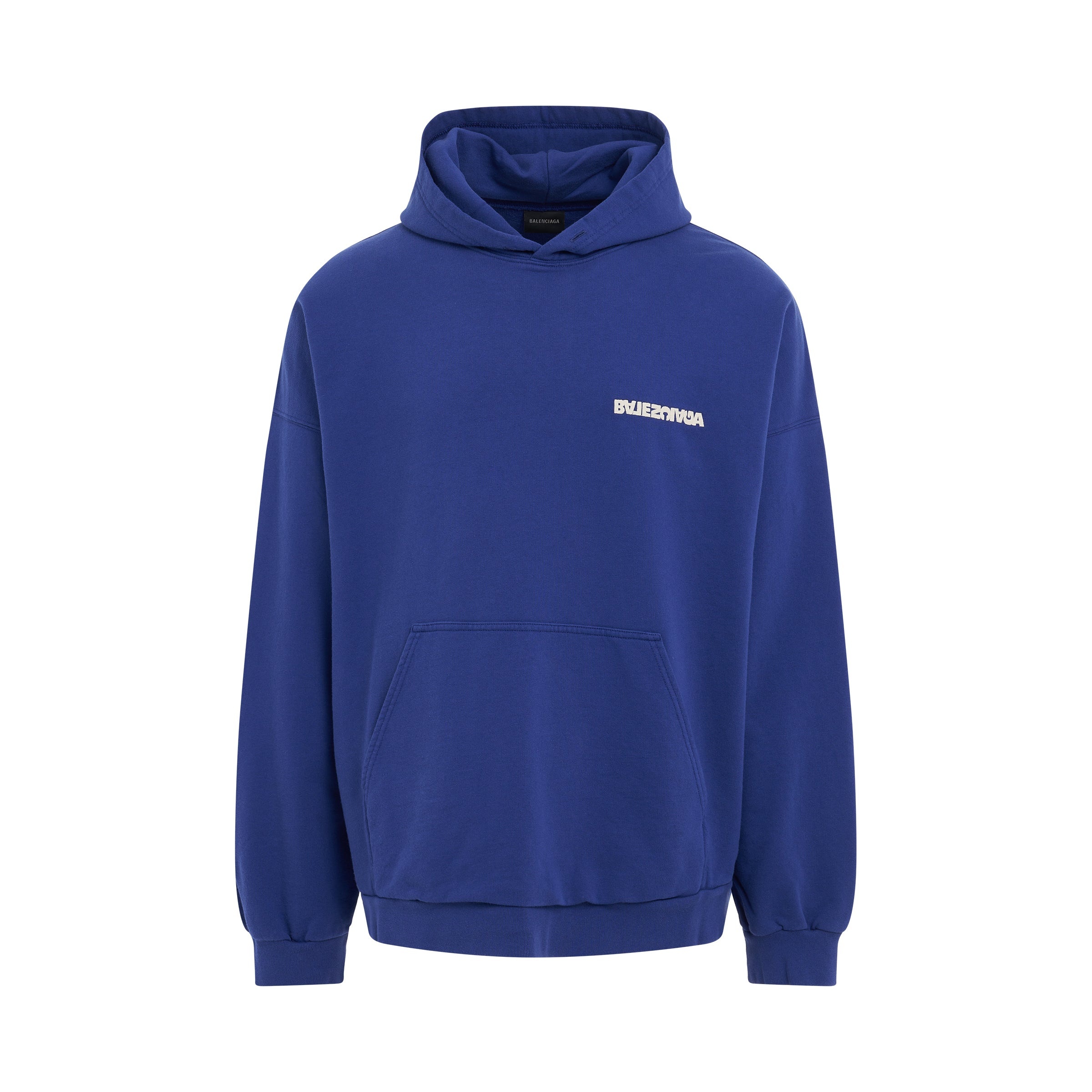 Long sleeves wide fit hoodie with contrast Balenciaga logo printed on chest and on the back. Fixed hood, one front kangaroo pocket and ribbed finishes on cuffs and hem. Wide fit. • Composition: 100% Cotton • Colour: Indigo/Dirty White • Fixed hood • Wide fit • Unisex SKU: 674986TNVB64388