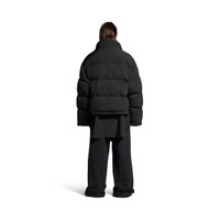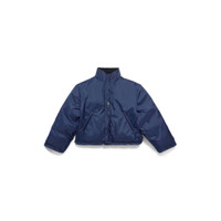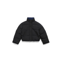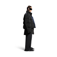 Reversible Puffer in black matte technical twill and dark blue recycled nylon is from look 33 of Balenciaga Winter 24 Collection. PRODUCT DETAILS • Matte technical twill and recycled nylon • This item is unisex • Reversible, one side black and the other dark blue • High collar • Snap button and invisible zip tab front • 2 zipped slash pockets • Elasticated drawstrings at waistline • Loop sports icon embroidered logo at chest • Same details on the dark blue side • Made in Italy Main material 1: 100% polyester - Main material 2: 100% polyamide - Padding 1 : 60% silk, 40% polylactide - Padding 2: 100% polyester - Embroidery: 100% polyester