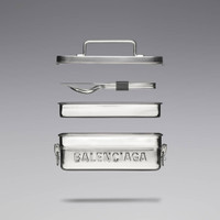 Lunch Box in silver stainless steel and silicone PRODUCT DETAILS • Dimensions: L5,8 x H4,9 x W2,9 inch • Weight: 952 g • Stainless steel and silicone • Chrome finish • Balenciaga logo • Comes with a cutlery set (1 fork, 1 knife, 1 spoon) • Made in Italy • Suitable for dishwashers • Not suitable for microwaves Material: 95% stainless steel, 5% silicone