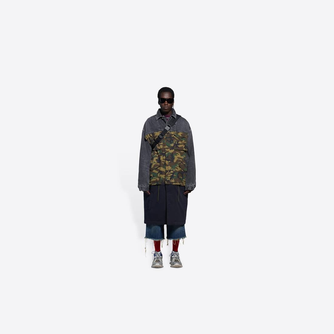 3 Piece Carcoat in khaki cotton drill washed black denim and dark blue stretch gabardine PRODUCT DETAILS • Cotton drill, washed denim and stretch gabardine patchwork • Checked cotton lining • Set-in sleeve construction • Shirt collar • Knee length • Concealed butonned front with 1 visible button at top • Made in Japan • Dry cleaning • Model is 190 cm / 6'2.80" and is wearing a FR size 46 Material: 100% cotton
