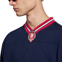 3B Football Long Sleeve V-Neck T-Shirt in dark navy and red dry jersey PRODUCT DETAILS • Dry jersey • V-neck • Dropped shoulders • Long sleeves • Gathered cuffs • 3B sports icon artwork printed and embroidered at front and back • Made in Portugal Main material: 100% cotton