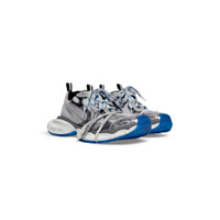 3XL Sneaker in grey, white and blue mesh and polyurethane PRODUCT DETAILS • Leather free • Sneaker • Mesh and polyurethane • Worn-out effect • Balenciaga logo at the edge of the toe and at back • Embossed size on the upper and at the back of the heel • 3XL rubber branding on the tongue with reflective detail • Back pull-on tab and tongue pull-on tab with reflective detail • Caution: extra laces are tied around the shoes for styling purpose and should be removed before use • Made in China • Wipe with a soft cloth Material: 55% polyrethane, 45% polyester