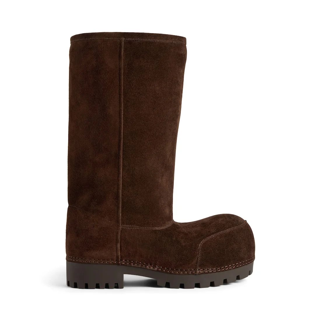 Alaska Fur High Boot in light espresso split calfskin and synthetic material PRODUCT DETAILS • Split calfskin, wool and synthetic material • High boot • Extra round toe • Thick tone-on-tone rubber sole • Exaggerated proportions • Balenciaga logo and details stamped at back • Made in Italy Upper: calfskin - Sole: polyurethane, rubber - Insole: wool, polyester, acrylic