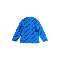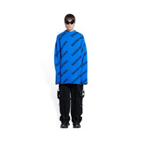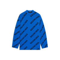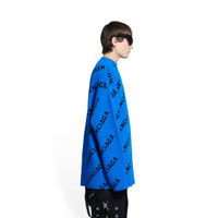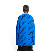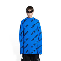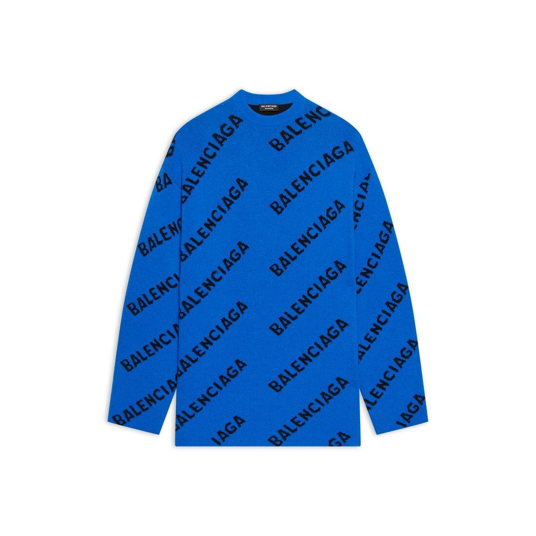 Allover Logo Sweater in blue and black wool knit PRODUCT DETAILS • Allover logo wool knit • This item is unisex • Large fit • Crewneck • Long sleeves • Dropped shoulder • Ribbed finishing at collar • Placed diagonal Balenciaga logo from sleeves to front • Made in Italy • Dry cleaning • Model is 181 cm / 5'93'' and is wearing a FR size S Material: 100% virgin wool