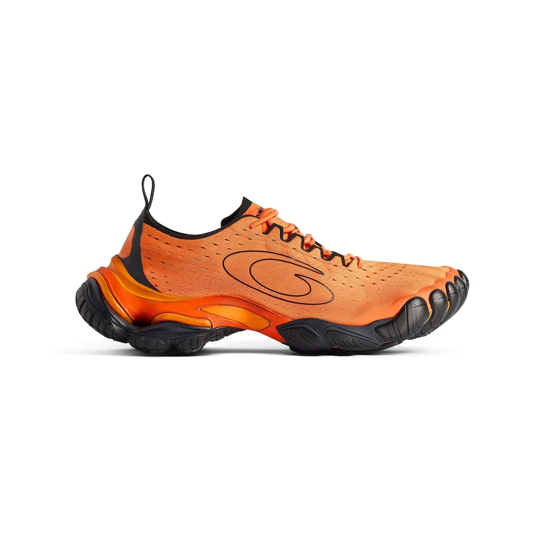 Anatomic Runner Sneaker in orange, grey and black polyester PRODUCT DETAILS • Slip-on sneaker • Polyester • Five toe anatomical shape • Elastic laces on the upper • Balenciaga logo printed on the tongue • Loop sport icon artwork on each side • Debossed size at back of the heel • Balenciaga logo debossed at the back of the sole • Back pull-on tab • Made in China Upper: polyester - Sole: rubber, EVA - Insole: foam