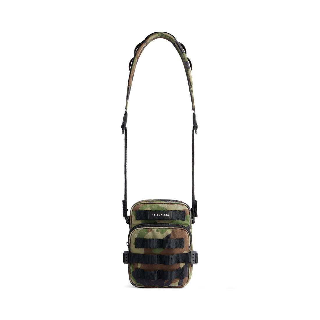 Army Crossbody Messenger Bag in dark green camo printed used recycled nylon PRODUCT DETAILS • Dimensions: L8,8 x H6,3 x W1,7 inch • Camo printed used nylon • Messenger bag • Adjustable and removable crossbody strap (23,6 inch) • Balenciaga logo patch at front • Matte black hardware • MOLLE loop system • Adjustable straps at sides • Zipped closure • 1 front zipped pocket • 1 main compartment • 1 inner patch pocket • BB logo engraved on zipper puller • Made in Italy Material: polyamide, polyester