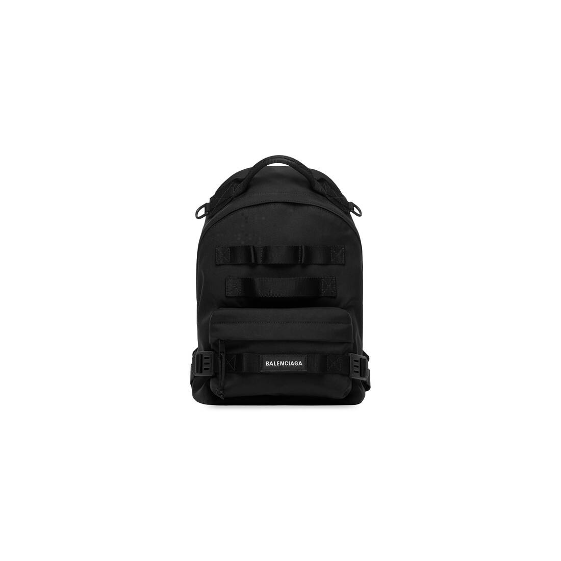 Army Small Multicarry Backpack in black recycled nylon PRODUCT DETAILS • Dimensions : L6,3 x H14,1 x W9,4 inch • Recycled nylon • Backpack • One top handle • Two hooks • Top double-ended zip-fastening closure • Adjustable shoulder straps • Balenciaga logo patch on front • 1 inner zipped • Cotton canvas lining • Made in Italy • Wipe with a soft cloth Material: 100% polyamide