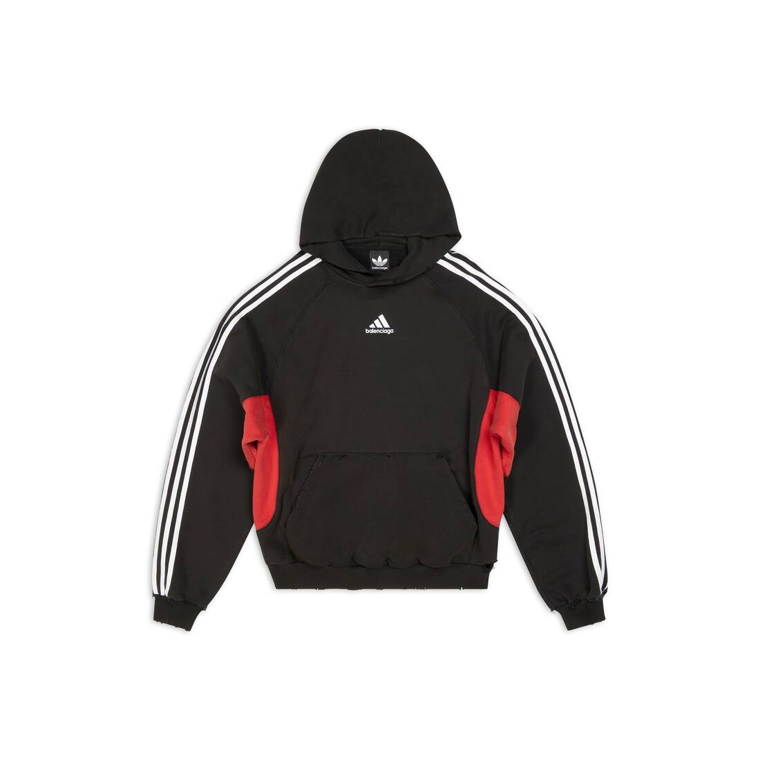 adidas Hoodie Small Fit in black, red and white medium curly fleece is done in collaboration with adidas. PRODUCT DETAILS • Medium curly fleece • Small fit • Hood without drawstring • Raglan sleeves • 1 kangaroo pocket on front • Contrasting yokes on sides • Worn-out effect • adidas 3-Bars and Balenciaga logos embroidered at front • Contrasting 3-Stripes mark on shoulders and sleeves • adidas® collaboration • The Trefoil logo, the 3-Bars logo and the 3-Stripes mark are registered trademarks of adidas • Made in Portugal • Dry cleaning • The model is wearing a size S Material: 100% cotton