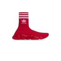 adidas Speed Sneaker in red and white knit and red sole unit is done in collaboration with adidas. PRODUCT DETAILS • Technical 3D knit • Ultra-flexible molded sole • "No Memory” sole technology monocolor sole unit • Extra light: nearly barefoot feel • Embossed Balenciaga logo on the back of sole • Contrasting 3-Stripes mark on the top of the ankle • adidas Trefoil and Balenciaga logos on exterior knit on each side • adidas® collaboration • The Trefoil logo, the 3-Bars logo and the 3-Stripes mark are registered trademarks of adidas • Made in Italy • Do not machine wash and wipe with a soft cloth Material: 85% polyester, 15% elastane