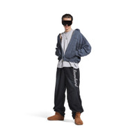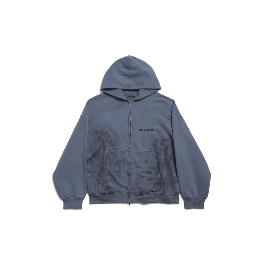 Balenciaga Back Zip-Up Hoodie Regular Fit in faded dark blue painted dry fleece for Men PRODUCT DETAILS • Painted dry fleece • Hood without drawstring • Zipped front • Dropped shoulders • 2 pockets at front • Gathered at cuffs and waistline • Balenciaga Back embroidery at front and back • Made in Portugal Main material: 100% cotton