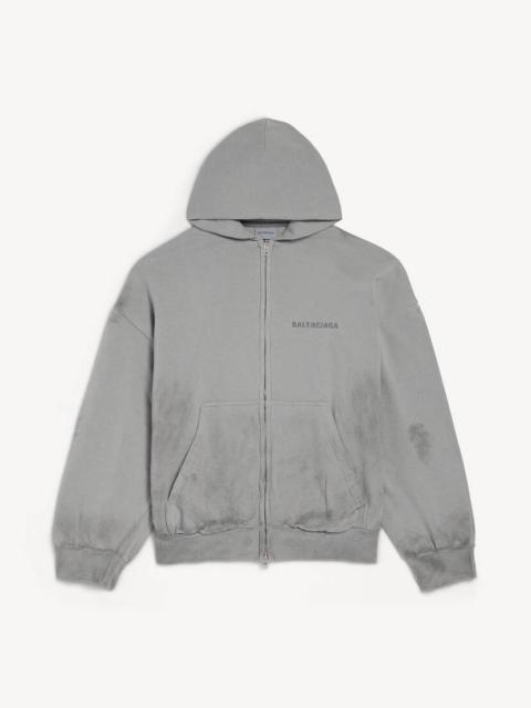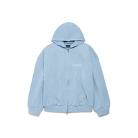 Balenciaga Back Zip-Up Hoodie Regular Fit in light blue and white dry fleece dry fleece PRODUCT DETAILS • Dry fleece • Hood without drawstring • Dropped shoulders • Double-ended zip fastening • 2 pockets at front • Gathered at cuffs and waistline • Balenciaga back artwork embroidered at front and back • Made in Portugal Main material: 100% cotton