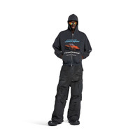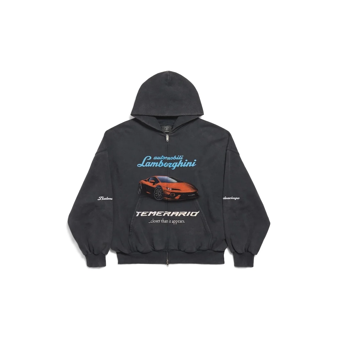 Balenciaga I Automobili Lamborghini Zip-Up Hoodie Small Fit in faded black dry fleece PRODUCT DETAILS • Dry fleece • Hood without drawstring • Zipped front • Dropped shoulders • 2 pockets at front • Gathered at cuffs and waistline • Lamborghini tee artwork printed at front and back • Designed by Balenciaga for Automobili Lamborghini • In collaboration with Automobili Lamborghini • Made in Portugal Main material: 100% cotton