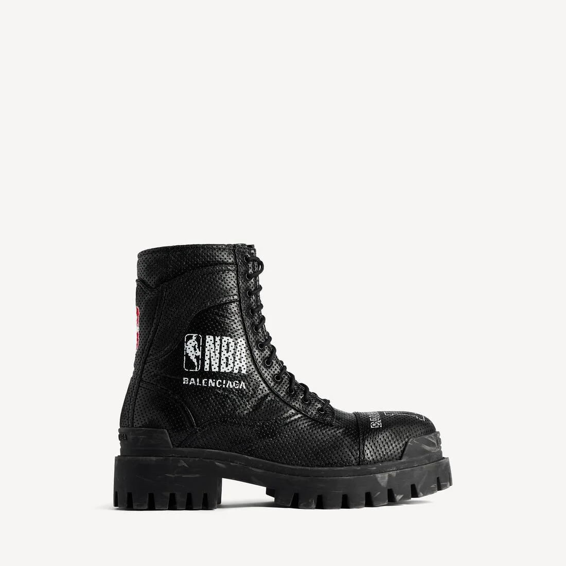 BALENCIAGA | NBA COLLABORATION Combat Strike Boot in black perforated Arena lambskin PRODUCT DETAILS • Perforated Arena lambskin • Lace-up boot • Extra round toe • Worn-out effect • 20mm arch • Inner zip • NBA artwork printed on the upper • Loop sport icon artwork printed on the inner side • In collaboration with the NBA • Visible top-stitching • 11 eyelets lace-up vamp • Thick toothed rubber outsole • Balenciaga logo in the front and in the back • Made in Italy • The NBA and individual NBA member team identifications reproduced on this product are trademarks and copyrighted designs, and/or other forms of intellectual property, that are the exclusive property of NBA Properties, Inc. and the respective NBA member teams and may not be used, in whole or in part, without the prior written consent of NBA Properties, Inc. © 2026 NBA Properties, Inc. All rights reserved. Upper: lambskin - Sole: TPU, polyurethane - Insole: calfskin