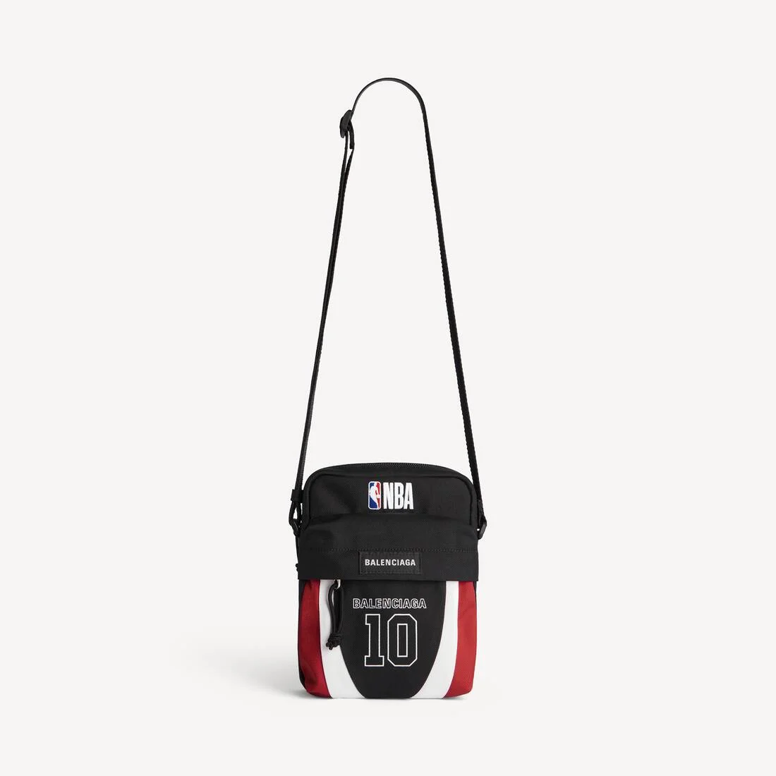 BALENCIAGA | NBA COLLABORATION Explorer Crossbody Pouch in black, white and vermillon recycled nylon PRODUCT DETAILS • Polyamide and polyester • Pouch • Adjustable crossbody strap • NBA artwork embroidered at front • In collaboration with the NBA • Balenciaga logo patch at front • Matte black hardware • Zipped closure • Front zipped pocket • 1 main compartment • 1 inner flat pocket • BB logo engraved on zipper puller • Cotton canvas lining • Made in Italy • The NBA and individual NBA member team identifications reproduced on this product are trademarks and copyrighted designs, and/or other forms of intellectual property, that are the exclusive property of NBA Properties, Inc. and the respective NBA member teams and may not be used, in whole or in part, without the prior written consent of NBA Properties, Inc. © 2026 NBA Properties, Inc. All rights reserved. Material: polyamide, polyester