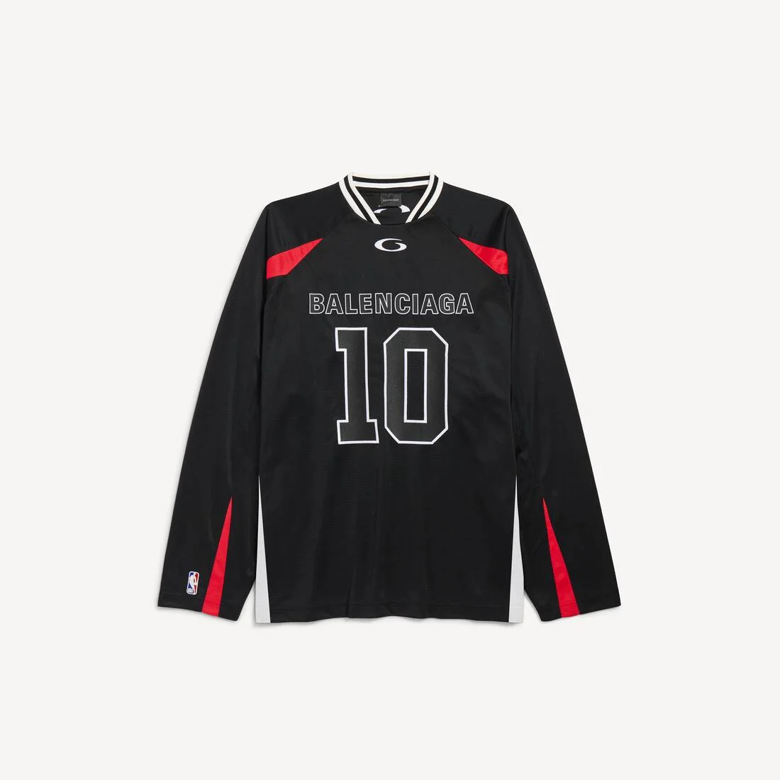 BALENCIAGA | NBA COLLABORATION Oversized Long Sleeve T-Shirt in black, red and white dry jersey PRODUCT DETAILS • Dry jersey • Crewneck with contrasting bands • Contrasting yokes • Long sleeves • NBA artwork and loop sports icon artwork embroidered at front, back and sleeve • In collaboration with the NBA • Made in Portugal • The NBA and individual NBA member team identifications reproduced on this product are trademarks and copyrighted designs, and/or other forms of intellectual property, that are the exclusive property of NBA Properties, Inc. and the respective NBA member teams and may not be used, in whole or in part, without the prior written consent of NBA Properties, Inc. © 2026 NBA Properties, Inc. All rights reserved. Main material: 100% cotton