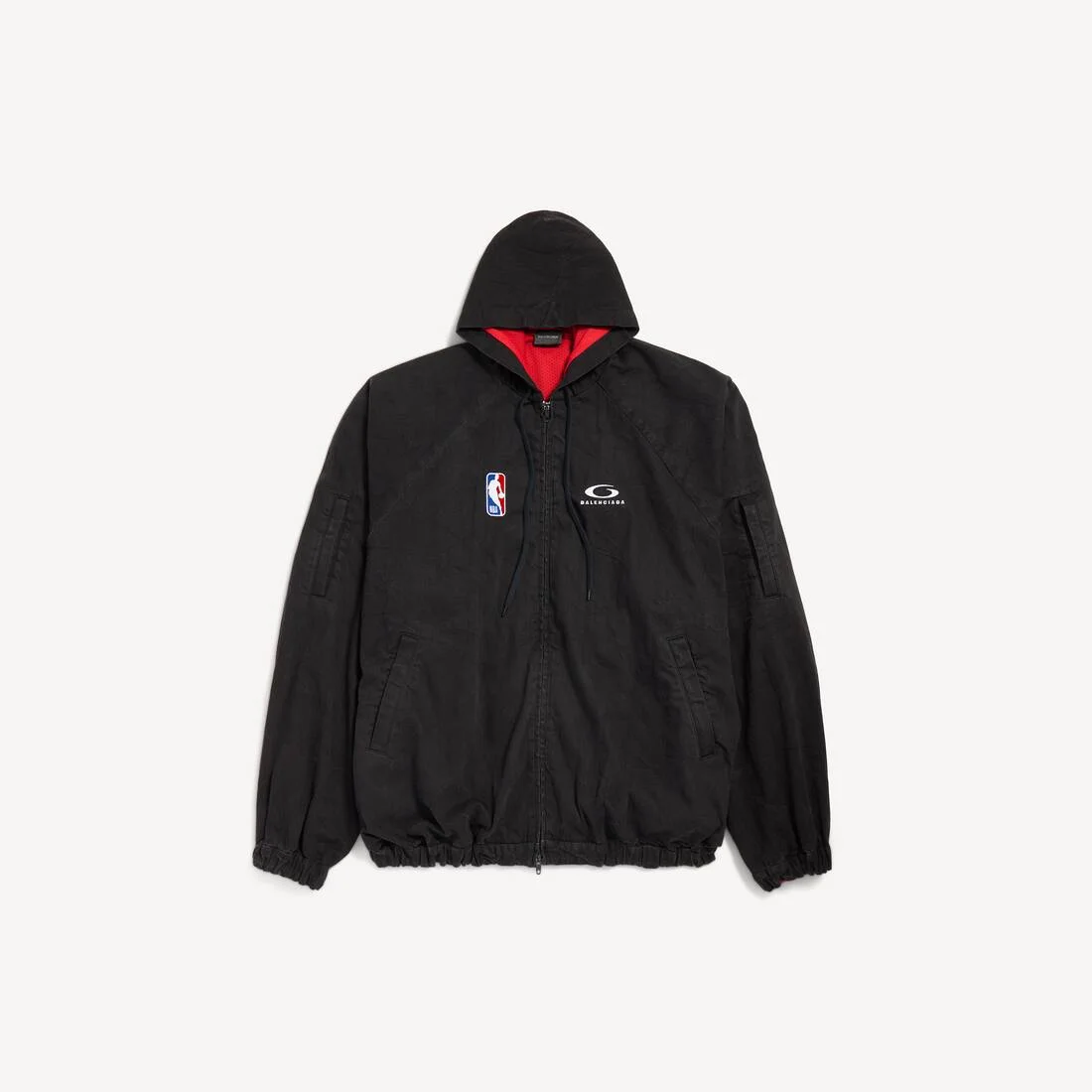 BALENCIAGA | NBA COLLABORATION Zip-Up Jacket in lightweight black denim PRODUCT DETAILS • Cotton denim • Red technical fabric lining • Hood with drawstrings • Elasticated sleeves and waistband • Front zip closure with double pull tab • 2 slash pockets at front • 2 sleeve pockets • Loop sports icon artwork embroidered on left chest • NBA artwork embroidered on right chest • In collaboration with the NBA • Made in Japan • The NBA and individual NBA member team identifications reproduced on this product are trademarks and copyrighted designs, and/or other forms of intellectual property, that are the exclusive property of NBA Properties, Inc. and the respective NBA member teams and may not be used, in whole or in part, without the prior written consent of NBA Properties, Inc. © 2026 NBA Properties, Inc. All rights reserved. Main material: 100% cotton