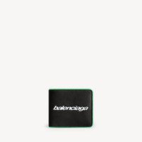 Biker Square Folded Wallet in black and vivid green lambskin PRODUCT DETAILS • Lambskin • Square folded wallet • Rounded edges • Balenciaga logo embossed and printed at front • 8 card slots • 2 bill pockets • 2 receipt compartments • Made in Italy Material: lambskin