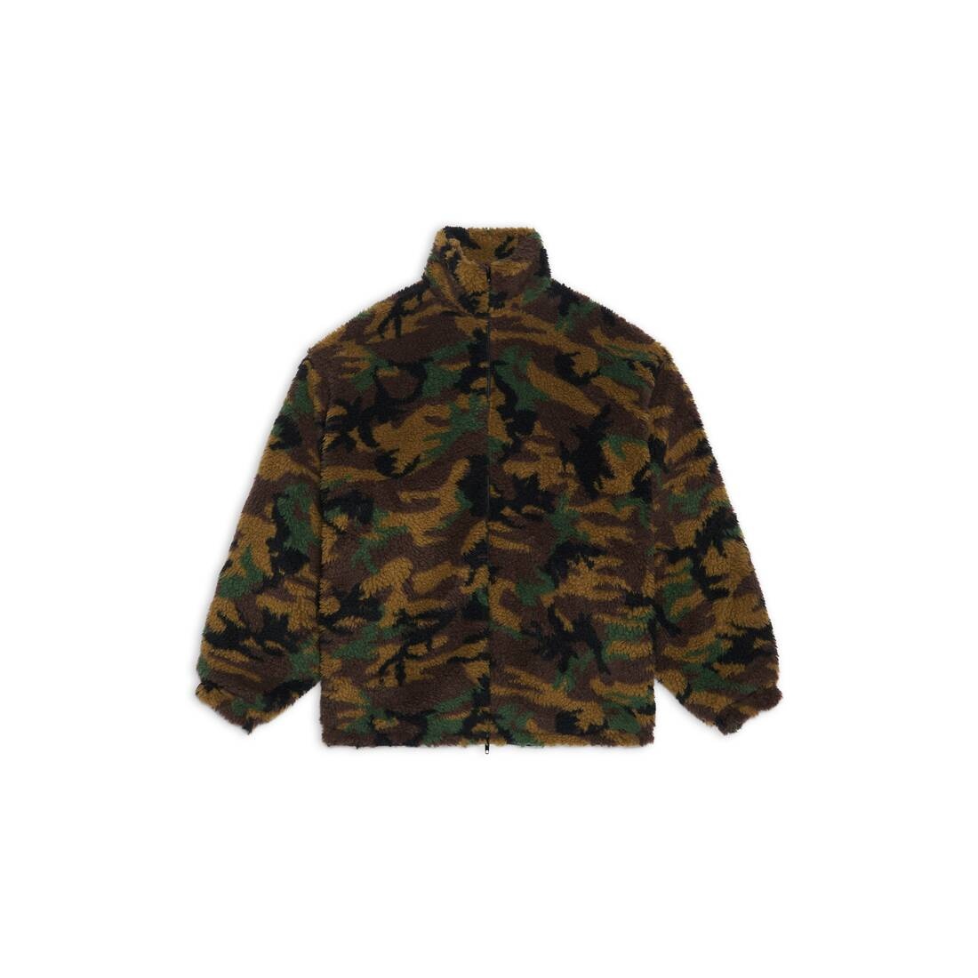 Camo Zip-Up Jacket in dark green fleece PRODUCT DETAILS • Camo printed fleece • This item is unisex • Extra large fit • High neck • Zipped front • 2 slash pockets at side • Gathered at cuffs • Drawstrings at the bottom • Balenciaga logo tab at side • Made in Italy • Dry cleaning • Model is 181 cm / 5'93'' and is wearing a FR size 46 Material: 54% polyester, 23% hemp, 23% acrylic