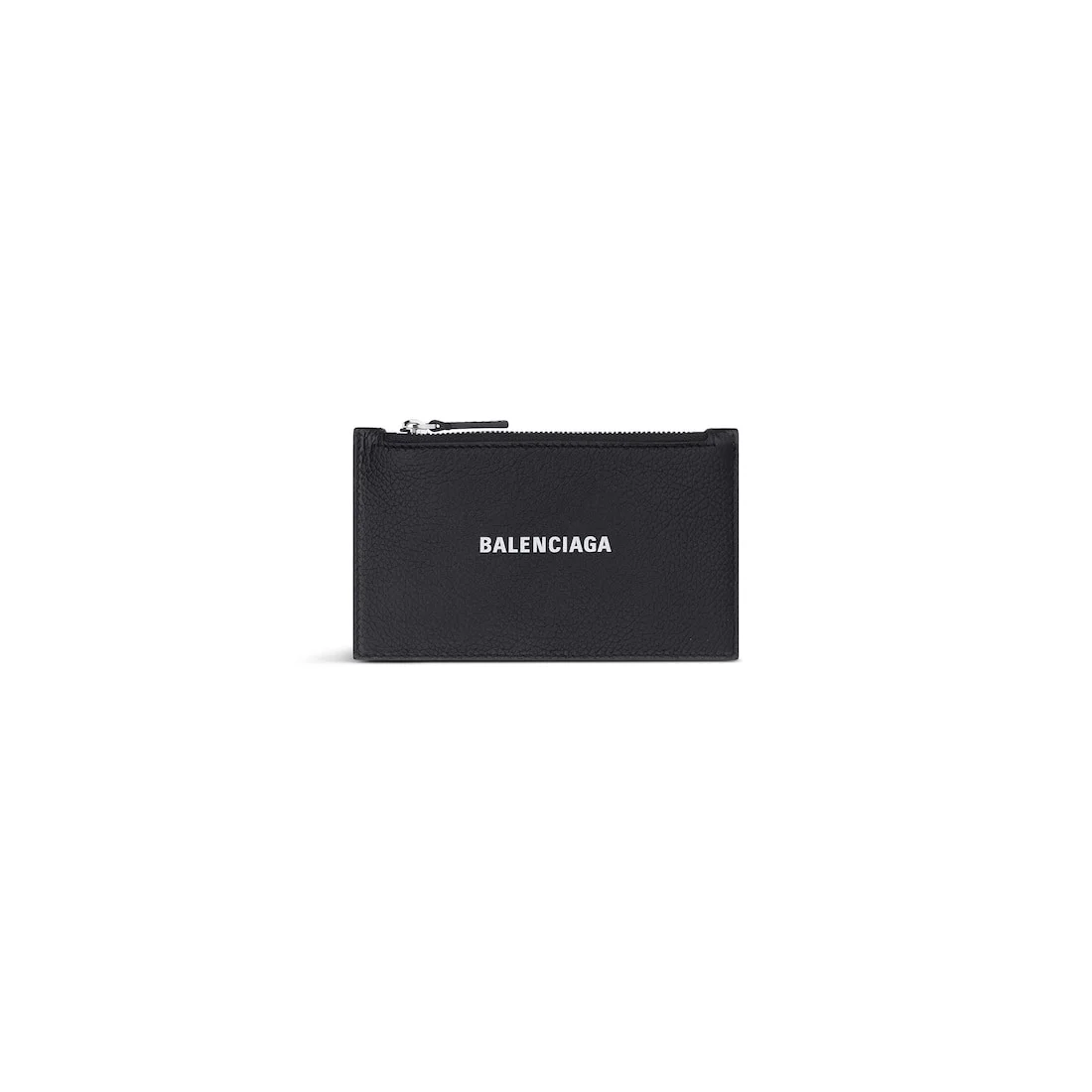 Cash Long Coin And Card Holder in black and white grained calfskin PRODUCT DETAILS • Dimensions : L5,3 x H2,7 x W0,7 inch • Grained calfskin • Large long coin and card holder • Balenciaga logo printed at front • Silver semi-shiny hardware • 1 zipped coin pouch • 1 receipt compartment • 5 card slots • Made in Italy • Wipe with a soft cloth Material: 100% calfskin