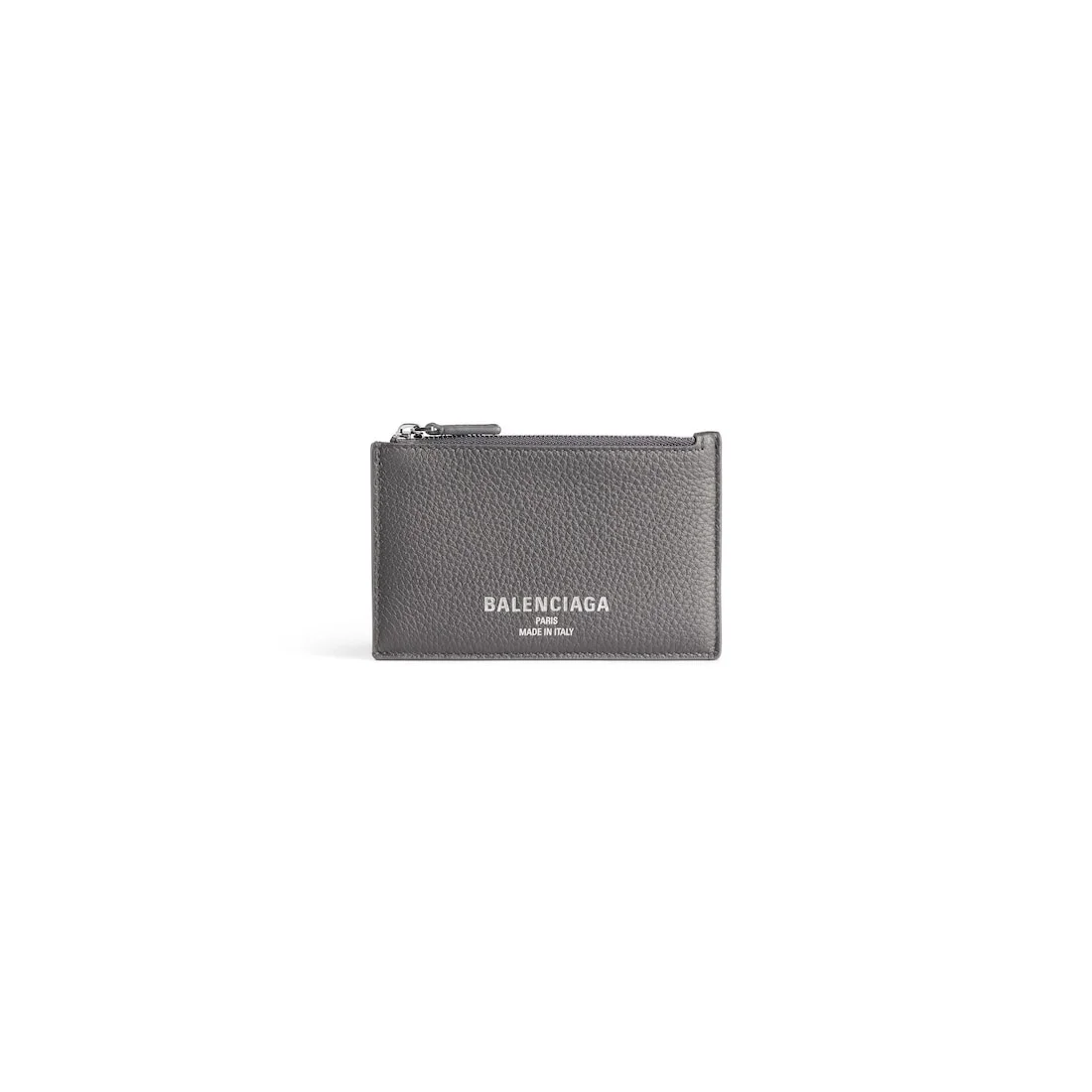 Credit Long Coin And Card Holder in grey grained calfskin PRODUCT DETAILS • Dimensions: L5,3 x H3,1 x W0,7 inch • Grained calfskin • Large long coin and card holder • Balenciaga Paris logo debossed with silver foil at front • Aged-silver hardware • 1 zipped coin pouch • 1 receipt compartment • 5 card slots • Made in Italy Material: calfskin