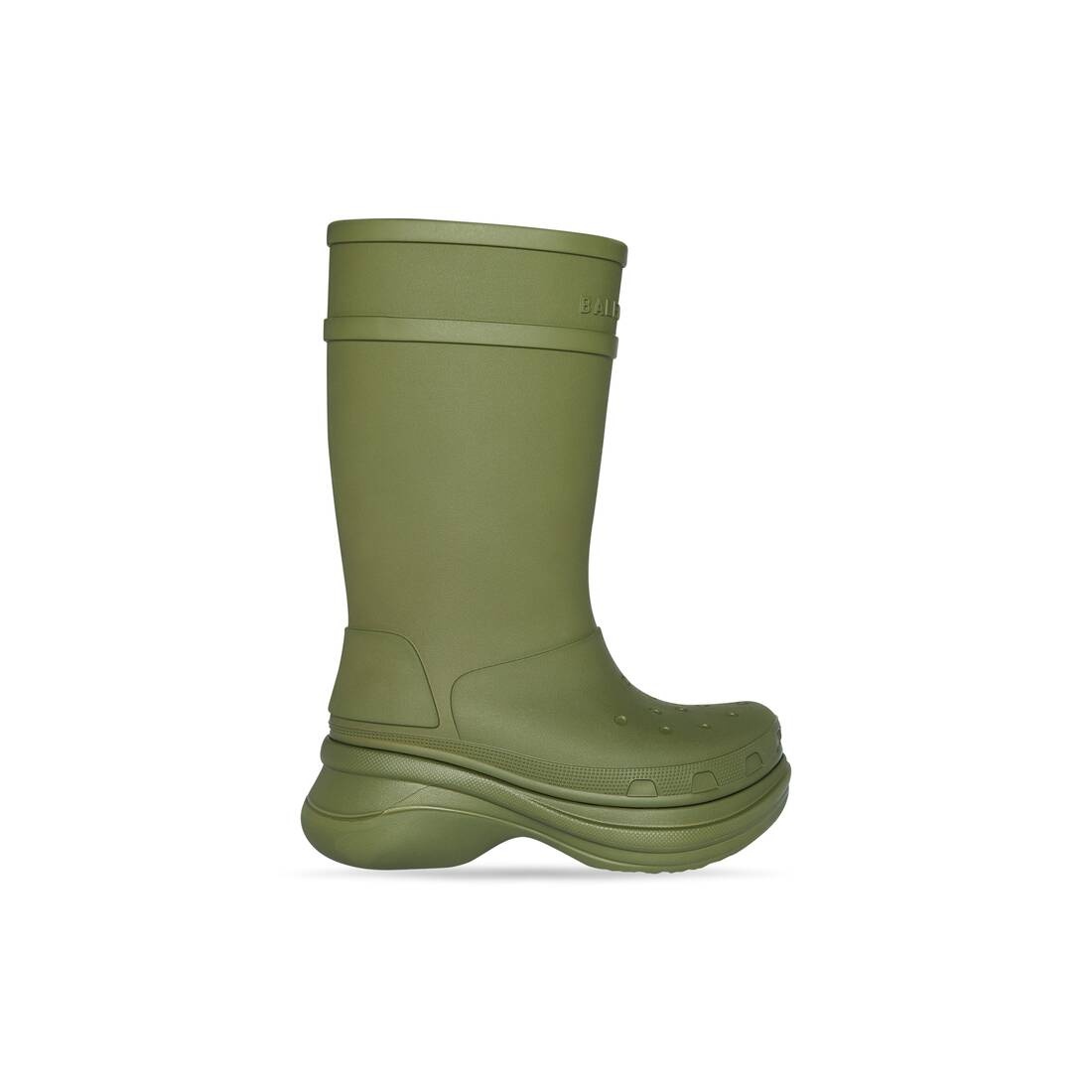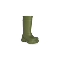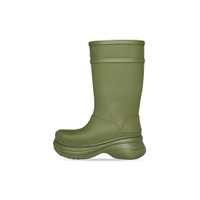 Crocs™ Boot in dark green rubber PRODUCT DETAILS • Rubber • Boot • Round toe • 20mm arch • Balenciaga logo debossed at front • Embossed size at back • Made in China • Crocs™ collaboration • Wipe with a soft cloth Material: 100% EVA