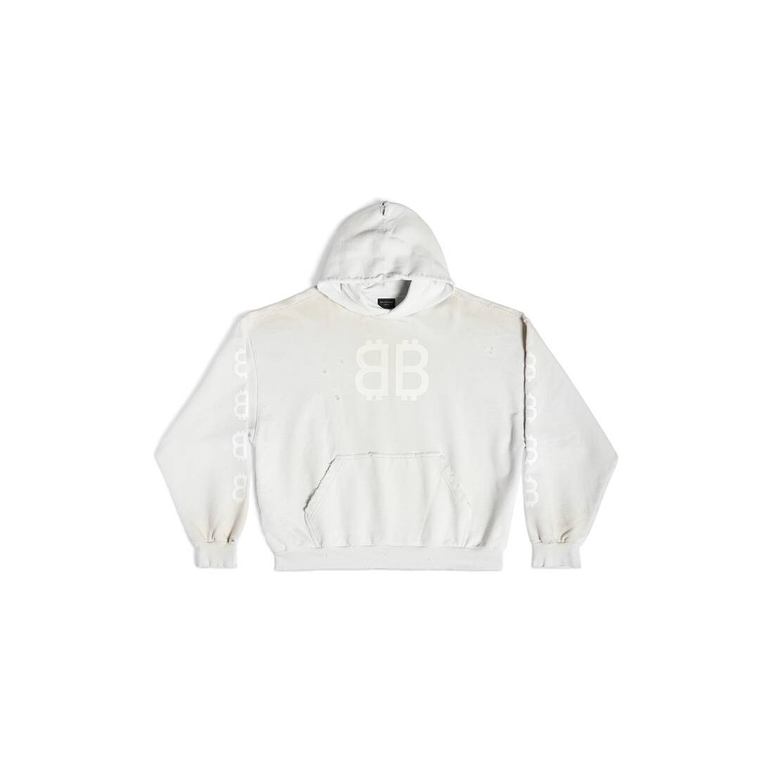 Crypto Hoodie Medium Fit in white curly fleece PRODUCT DETAILS • Curly fleece • This item is unisex • Medium fit • Hood without drawstring • Dropped shoulders • 1 kangaroo pocket on front • Gathered at cuffs and waistline • Crypto artwork printed at front, back and sleeves • Destroyed and dirty effect • Made in Portugal • Dry cleaning • The model is wearing a size S Material: 100% cotton