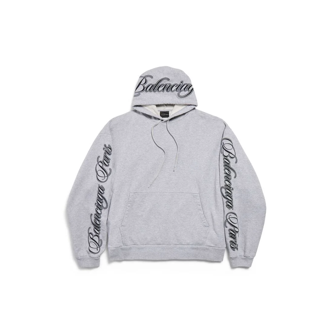 Cursive Oversized Hoodie in light heather grey and black dry fleece PRODUCT DETAILS • Dry fleece • Hood with drawstring • Dropped shoulders • 1 kangaroo pocket on front • Gathered at cuffs and waistline • Cursive artwork embroidered at front and back • Made in Portugal Main material: 100% cotton