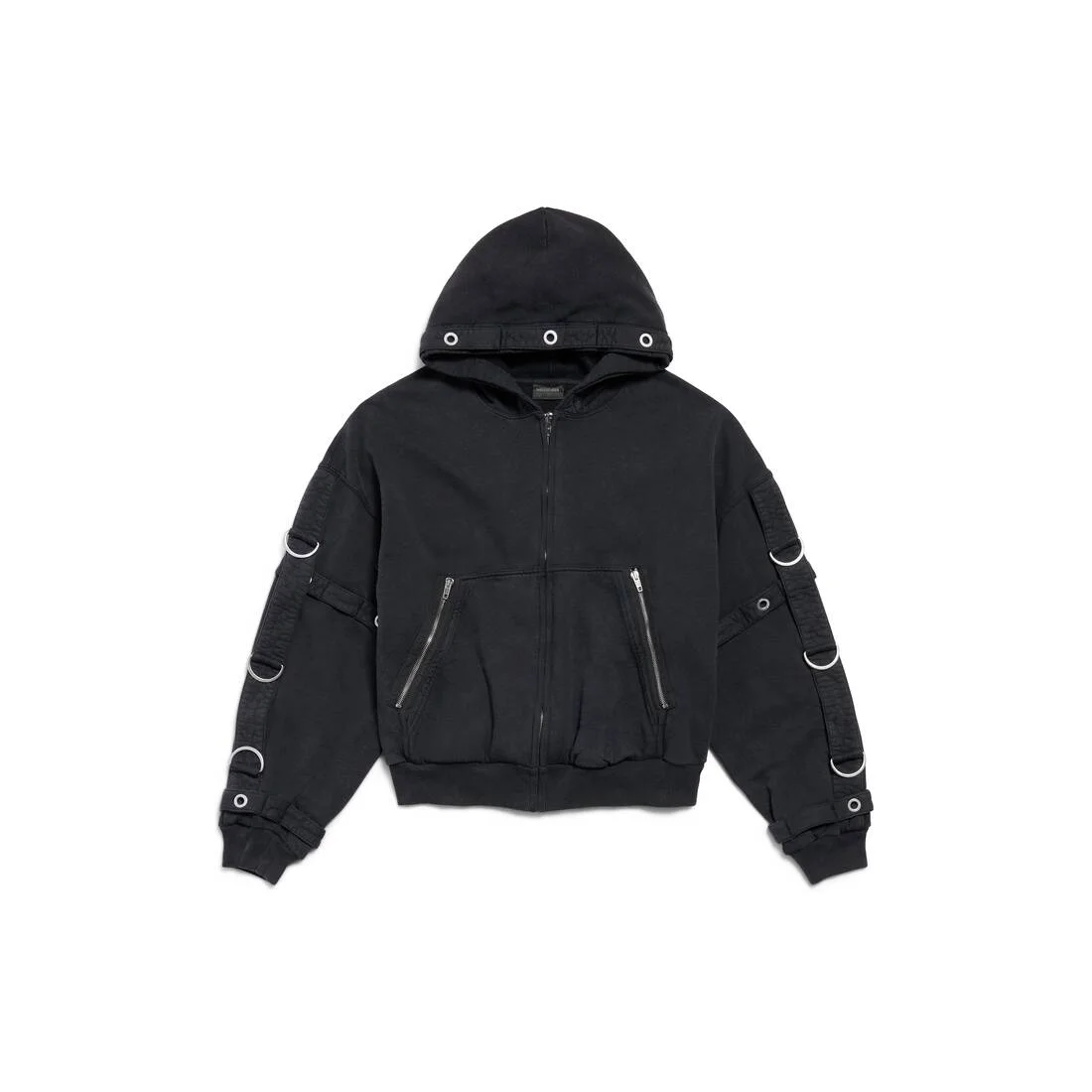 D-Ring Cargo Zip-Up Hoodie in faded black dry fleece PRODUCT DETAILS • Dry fleece • Hood without drawstring • Dropped shoulders • Zipped front • Double-ended zip fastening • 2 zipped pockets at front • Gathered at cuffs and waistline • Metallic eyelets and D-rings • Tabs on sleeves • Zipper at back • Made in Portugal Main material: 100% cotton