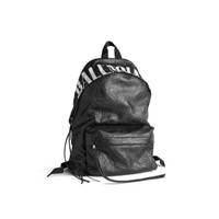 Editor Backpack in black and white vintage Arena Storico lambskin PRODUCT DETAILS • Dimensions: L13,3 x H18,1 x W6,3 inch • Vintage Arena Storico lambskin • Backpack • One top handle • Adjustable shoulder straps • Balenciaga logo printed at front • Aged-silver hardware • Front zipped pocket • Zipped closure with knotted puller • 1 main compartment • 1 inner flat pocket • Balenciaga logo engraved zipper puller • Cotton canvas lining • Made in Italy Material: lambskin, polyester
