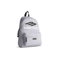 Explorer Backpack in grey, black and white jersey PRODUCT DETAILS • Dimensions: L13,7 x H18,5 x W7,8 inch • Jersey • Backpack • One top handle • Adjustable shoulder straps • 3B stencil logo printed at front • Balenciaga logo patch at front • Matte black hardware • Top double-ended zip-fastening closure • Front zipped pocket • 1 inner zipped pocket • 1 inner patch pocket • BB logo engraved zipper puller with cotton string • Cotton canvas lining • Made in Italy Material: cotton, polyester, polyamide