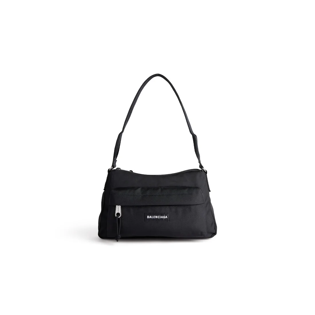 Explorer Sling Pouch in black recycled nylon PRODUCT DETAILS • Dimensions: L11,8 x H7,9 x W3,9 inch • Nylon • Sling pouch • Shoulder strap (drop: 7,9 inch) • Balenciaga logo patch at front • Matte black hardware • Front zipped pocket • Zipped closure • 1 main compartment • Back zipped pocket • Cotton canvas lining • Balenciaga logo engraved zipper puller with cotton string • Made in Italy • Wipe with a soft cloth Material: 95% polyamide, 5% polyester