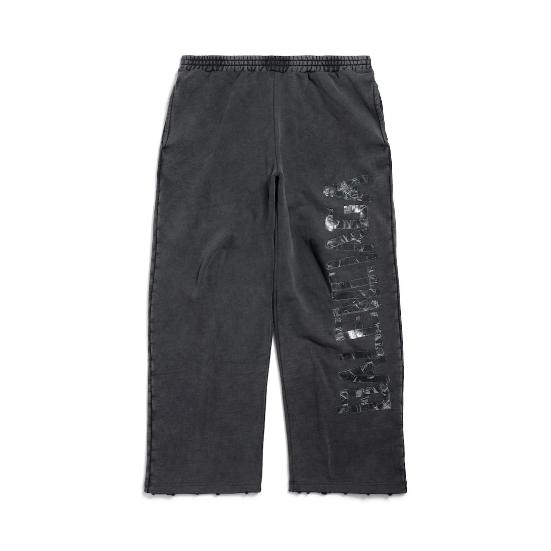 Transparent Tape Baggy Pants in faded black and white heavy fleece for Men. PRODUCT DETAILS • Heavy fleece • Worn-out details • Mid-waist • Elasticated waistband • 2 slash pockets • Transparent type artwork on right leg • Made in Italy Main material: 100% cotton