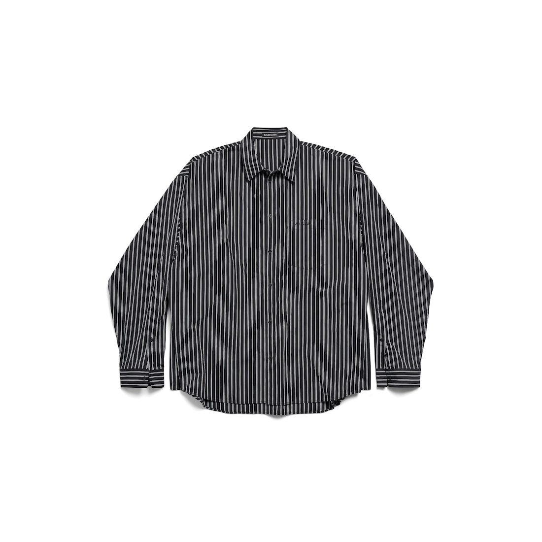 Flatground Shirt in black and white cotton stripe poplin is from look 29 of Balenciaga Spring 25 Collection. PRODUCT DETAILS • Cotton stripe poplin • Trompe l'œil construction: Flatground front shirt detail • Button-down collar • 6 button front • 1 patched pocket at chest with embroidered logo • Long sleeves • Buttoned cuffs • Balenciaga engraved buttons • Made in Italy Main material: 100% cotton